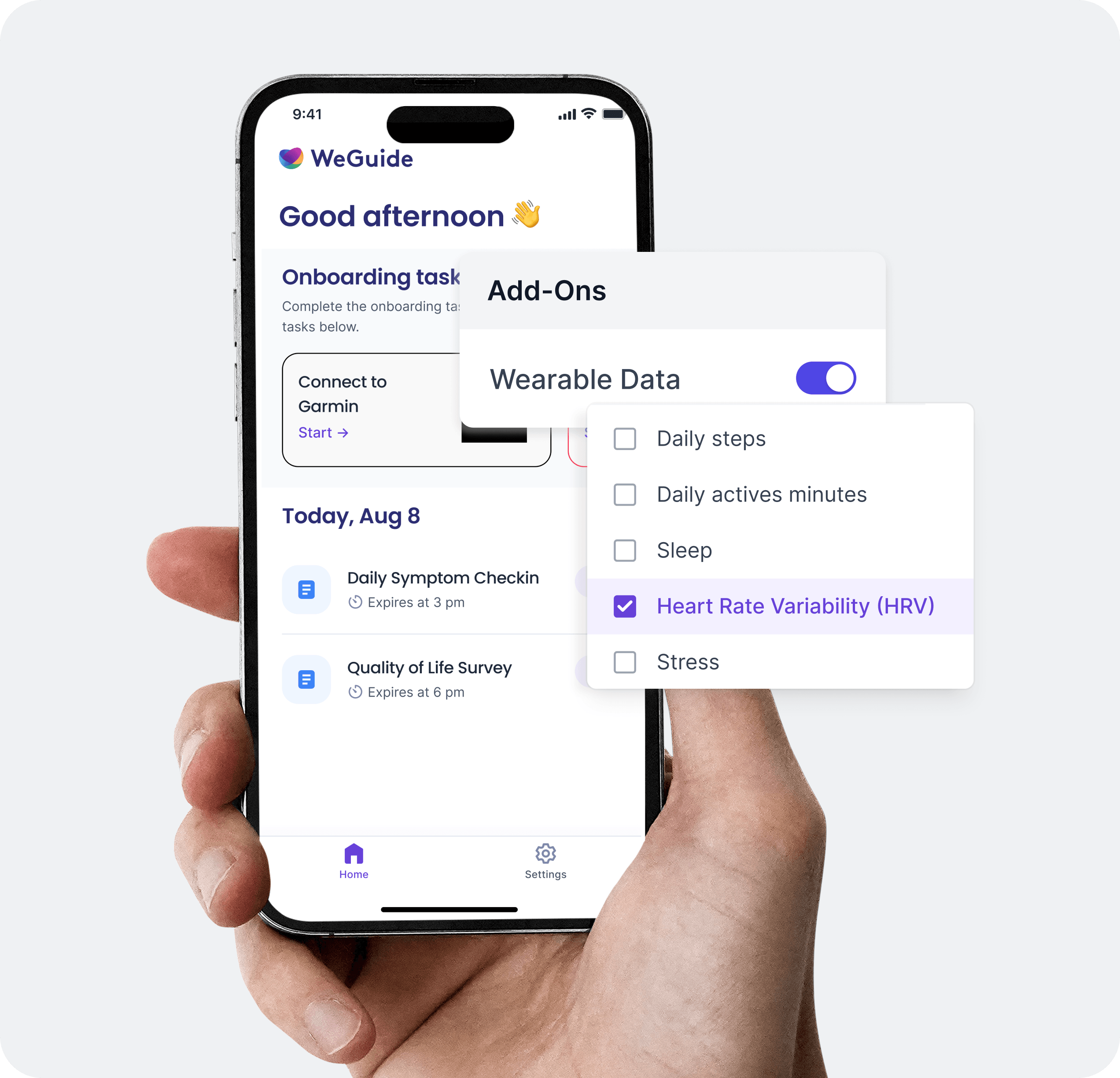 WeGuide ships native iOS and Android apps fully branded under your organisation's name and identity. The app becomes the study's home for the participant, which is a big part of why our studies average 94% adherence.