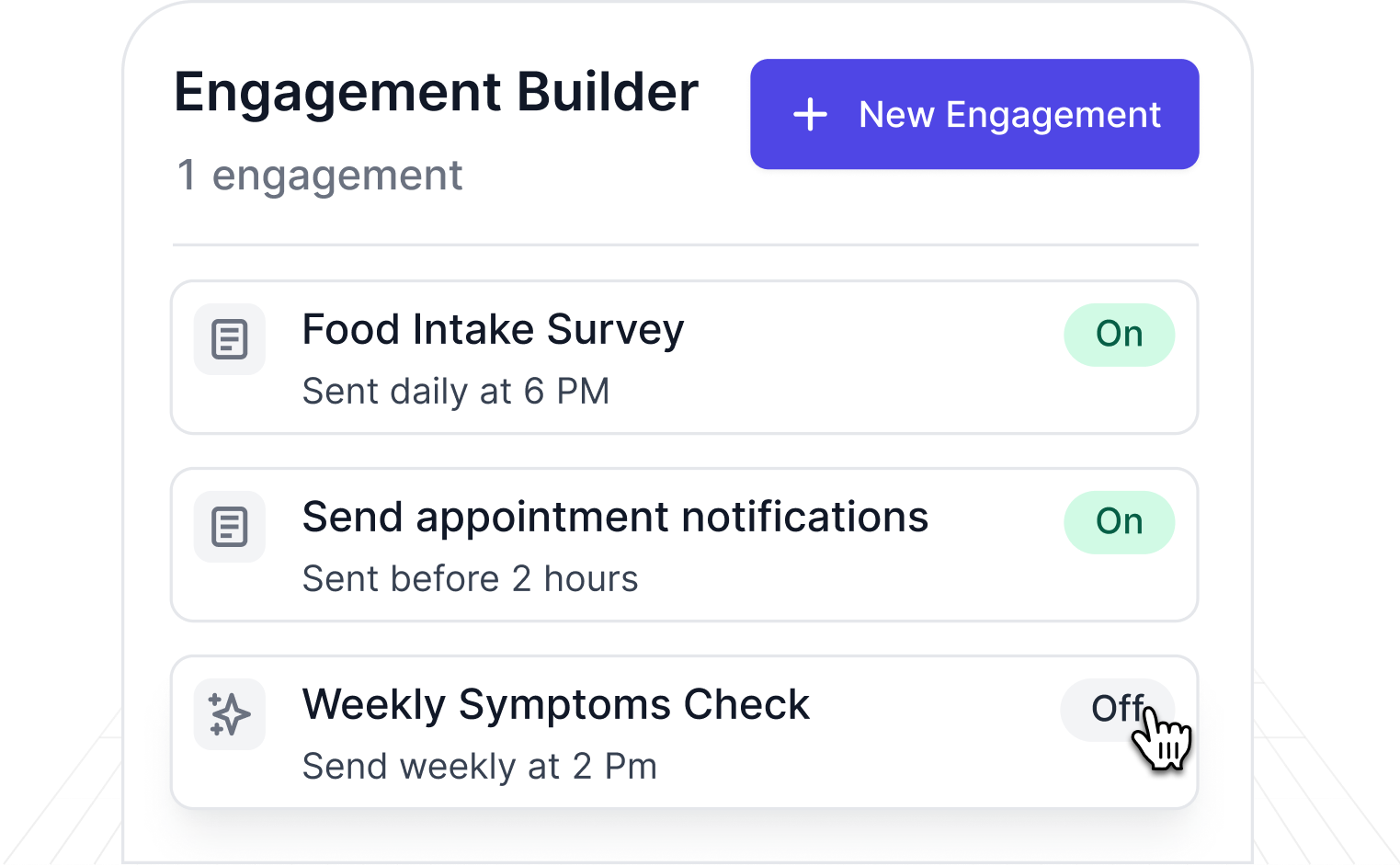 The platform supports a wide range of interactions, including reminders, forms, educational content, check-ins, surveys, and notifications. This gives healthcare providers the ability to keep patients engaged and informed throughout their care journey.